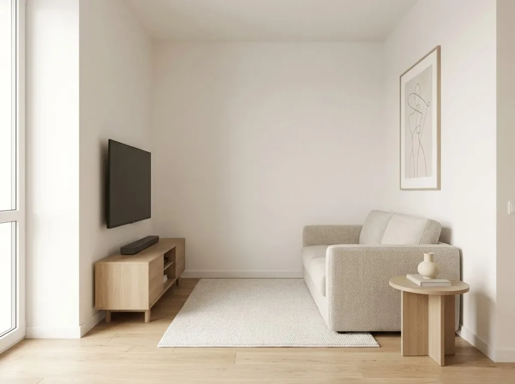 Use a slim simple TV stand. Hide all wires. Keep only 2 to 3 items on the unit โ one plant, one remote, nothing more.